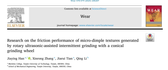 近日,天津理工大学海运学院韩佳颖团队在国际知名期刊《Wear》上发表题为“Research on the friction performance of micro-dimple textures generated by rotary ultrasonic-assisted intermittent grinding with a conical grinding wheel”的研究论文。该研究针对二维超声磨削设备复杂、成本高的行业痛点,提出基于锥形砂轮的高效微凹坑制备与摩擦性能优化方案,为机械制造领域表面纹理调控与减摩技术升级提供了全新路径。
