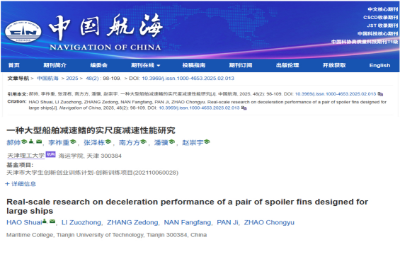 近日,天津理工大学海运学院郝帅团队在国内航海类高水平期刊《中国航海》上发表题为“一种大型船舶减速鳍的实尺度减速性能研究”的研究论文。为了提升现有船舶的减速性能,该研究提出了一种减速鳍装置,基于实尺度计算流体动力学(CFD)绕流阻力分析研究其减速性能,并对其减速效果进行仿真。研究表明,配备设计得当的减速鳍,可明显提升大型船舶的减速及转艏性能,从而大幅改善船舶操纵性及航行安全性。
