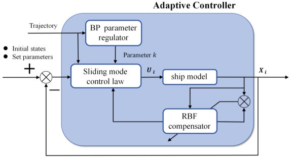 针对欠驱动船舶横向推进能力不足、易受外界扰动影响的问题,研究团队在滑模控制框架下,引入径向基函数(RBF)神经网络对模型不确定性进行在线补偿,提升系统在复杂工况下的鲁棒性与控制精度。